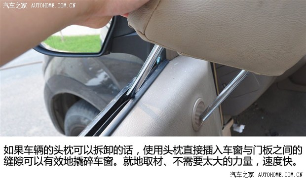 我們之前寫過關(guān)于在車內(nèi)怎樣破窗自救的方法,有像救生錘、破窗器這樣的專業(yè)小工具,如果沒有用車上隨手物品也可以施救,比如滅火器、頭枕的支架等。通過我們的實(shí)驗(yàn)已經(jīng)證明用頭枕的支架插入車玻璃的縫隙可以很有效地將玻璃撬碎,當(dāng)然前提是車輛頭枕是可以拆卸下來的,而不能拆卸頭枕的車輛只能利用其他工具來自救了。