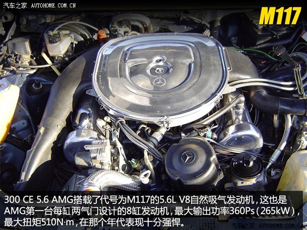 1987年,一款名為奔馳300 CE 5.6 AMG的車型成為了當(dāng)時德國市場中極速最高的量產(chǎn)車型,它搭載的每缸4氣門5.6L V8自然吸氣發(fā)動機代號為M117,其360Ps(265kW)的最大功率以及510N·m的最大扭矩令這款coupe車型跑出了303km/h的極速。同時,由于其優(yōu)異的性能表現(xiàn),這款車在美國市場也有不少車迷追捧,北美的車迷們?yōu)樗鹆艘粋€綽號:The Hammer(錘子)。