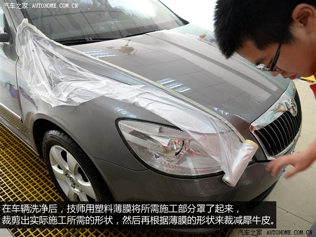 施工的第一步就是先將車輛洗凈,如果車身表面上有附著的污漬沒有被清除干凈,不僅在施工后保護層容易起泡,而且在貼犀牛皮時很可能會將污漬封進犀牛皮的保護層內部,影響最終測試效果。